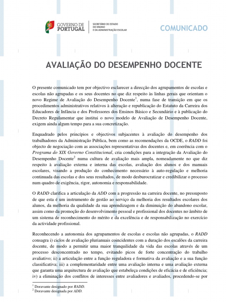 O presente comunicado tem por objectivo esclarecer a direco dos agrupamentos de escolas e escolas no agrupadas e os seus docentes no que diz respeito s linhas gerais que orientam o novo Regime de Avaliao do Desempenho Docente1, numa fase de transio em que os procedimentos administrativos relativos alterao e republicao do Estatuto da Carreira dos Educadores de Infncia e dos Professores dos Ensinos Bsico e Secundrio e publicao do Decreto Regulamentar que institui o novo modelo de Avaliao de Desempenho Docente, exigem ainda algum tempo para a sua concretizao. Enquadrado pelos princpios e objectivos subjacentes avaliao do desempenho dos trabalhadores da Administrao Pblica, bem como as recomendaes da OCDE, o RADD foi objecto de negociao com as associaes representativas dos docentes e, em coerncia com o Programa do XIX Governo Constitucional, cria condies para a integrao da Avaliao do Desempenho Docente2 numa cultura de avaliao mais ampla, nomeadamente no que diz respeito avaliao externa e interna das escolas, avaliao dos alunos e dos manuais escolares, visando a produo do conhecimento necessrio auto-regulao e melhoria continuada das escolas e dos seus resultados, de modo desburocratizar e credibilizar o processo num quadro de exigncia, rigor, autonomia e responsabilidade. O RADD clarifica a articulao da ADD com a progresso na carreira docente, no pressuposto de que esta um instrumento de gesto ao servio da melhoria dos resultados escolares dos alunos, da melhoria da qualidade da sua aprendizagem e da diminuio do abandono escolar, assim como da promoo do desenvolvimento pessoal e profissional dos docentes no mbito de um sistema de reconhecimento do mrito e da excelncia e de responsabilizao no exerccio da actividade profissional. Reconhecendo a autonomia dos agrupamentos de escolas e escolas no agrupadas, o RADD consagra i) ciclos de avaliao plurianuais coincidentes com a durao dos escales da carreira docente, de modo a permitir uma maior tranquilidade da vida das escolas atravs de um processo desconcentrado no tempo, evitando picos de forte concentrao do trabalho avaliativo; ii) a articulao entre a funo reguladora e formativa da avaliao e a sua funo classificativa; iii) a complementaridade entre uma avaliao interna e uma avaliao externa que garanta uma arquitectura de avaliao que estabelea condies de eficcia e de eficincia; iv) a eliminao dos conflitos de interesses entre avaliadores e avaliados, procedendo-se por