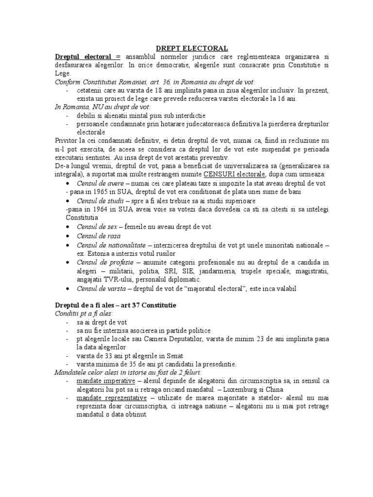 In orice democratie, alegerile sunt consacrate prin Constitutie si Lege. Conform Constitutiei Romaniei, art. 36, in Romania au drept de vot: - cetatenii care au varsta de 18 ani implinita pana in ziua alegerilor inclusiv. In prezent, exista un proiect de lege care prevede reducerea varstei electorale la 16 ani. In Romania, NU au drept de vot: - debilii si alienatii mintal pusi sub interdictie - persoanele condamnate prin hotarare judecatoreasca definitiva la pierderea drepturilor electorale Privitor la cei condamnati definitiv, ei detin dreptul de vot, numai ca, fiind in recluziune nu si-l pot exercita, de aceea se considera ca dreptul lor de vot este suspendat pe perioada executarii sentintei. Au insa drept de vot arestatii preventiv. De-a lungul vremii, dreptul de vot, pana a beneficiat de universalizarea sa (generalizarea sa integrala), a suportat mai multe restrangeri numite CENSURI electorale, dupa cum urmeaza: Censul de avere numai cei care plateau taxe si impozite la stat aveau dreptul de vot - pana in 1965 in SUA, dreptul de vot era conditionat de plata unei sume de bani Censul de studii spre a fi ales trebuie sa ai studii superioare -pana in 1964 in SUA aveai voie sa votezi daca dovedeai ca sti sa citesti si sa intelegi Constitutia Censul de sex femeile nu aveau drept de vot Censul de rasa Censul de nationalitate interzicerea dreptului de vot pt unele minoritati nationale ex. Estonia a interzis votul rusilor Censul de profesie anumite categorii profesionale nu au dreptul de a candida in alegeri militarii, politia, SRI, SIE, jandarmeria, trupele speciale, magistratii, angajatii TVR-ului, personalul diplomatic. Censul de varsta dreptul de vot de majoratul electoral, este inca valabil Dreptul de a fi ales art 37 Constitutie Conditii pt a fi ales: - sa ai drept de vot - sa nu fie interzisa asocierea in partide politice - pt alegerile locale sau Camera Deputatilor, varsta de minim 23 de ani implinita pana la data alegerilor - varsta de 33 ani pt alegerile in Senat - varsta minima de 35 de ani pt candidatii la presedintie. Mandatele celor alesi in istorie au fost de 2 feluri: - mandate imperative alesul depinde de alegatorii din circumscriptia sa, in sensul ca alegatorii lui pot sa ii retraga oricand mandatul. Luxemburg si China - mandate reprezentative utilizate de marea majoritate a statelor- alesul nu mai reprezinta doar circumscriptia, ci intreaga natiune alegatorii nu ii mai pot retrage mandatul o data obtinut.