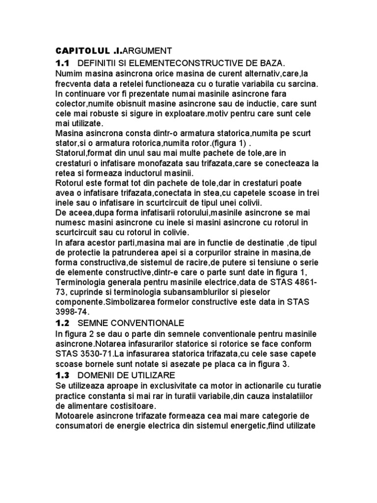 Numim masina asincrona orice masina de curent alternativ,care,la frecventa data a retelei functioneaza cu o turatie variabila cu sarcina. In continuare vor fi prezentate numai masinile asincrone fara colector,numite obisnuit masine asincrone sau de inductie, care sunt cele mai robuste si sigure in [Link] pentru care sunt cele mai utilizate. Masina asincrona consta dintr-o armatura statorica,numita pe scurt stator,si o armatura rotorica,numita rotor.(figura 1) . Statorul,format din unul sau mai multe pachete de tole,are in crestaturi o infatisare monofazata sau trifazata,care se conecteaza la retea si formeaza inductorul masinii. Rotorul este format tot din pachete de tole,dar in crestaturi poate avea o infatisare trifazata,conectata in stea,cu capetele scoase in trei inele sau o infatisare in scurtcircuit de tipul unei colivii. De aceea,dupa forma infatisarii rotorului,masinile asincrone se mai numesc masini asincrone cu inele si masini asincrone cu rotorul in scurtcircuit sau cu rotorul in colivie. In afara acestor parti,masina mai are in functie de destinatie ,de tipul de protectie la patrunderea apei si a corpurilor straine in masina,de forma constructiva,de sistemul de racire,de putere si tensiune o serie de elemente constructive,dintr-e care o parte sunt date in figura 1, Terminologia generala pentru masinile electrice,data de STAS 486173, cuprinde si terminologia subansamblurilor si pieselor [Link] formelor constructive este data in STAS 3998-74. 1.2 SEMNE CONVENTIONALE In figura 2 se dau o parte din semnele conventionale pentru masinile [Link] infasurarilor statorice si rotorice se face conform STAS [Link] infasurarea statorica trifazata,cu cele sase capete scoase bornele sunt notate si asezate pe placa ca in figura 3. 1.3 DOMENII DE UTILIZARE Se utilizeaza aproape in exclusivitate ca motor in actionarile cu turatie practice constanta si mai rar in turatii variabile,din cauza instalatiilor de alimentare costisitoare. Motoarele asincrone trifazate formeaza cea mai mare categorie de consumatori de energie electrica din sistemul energetic,fiind utilizate