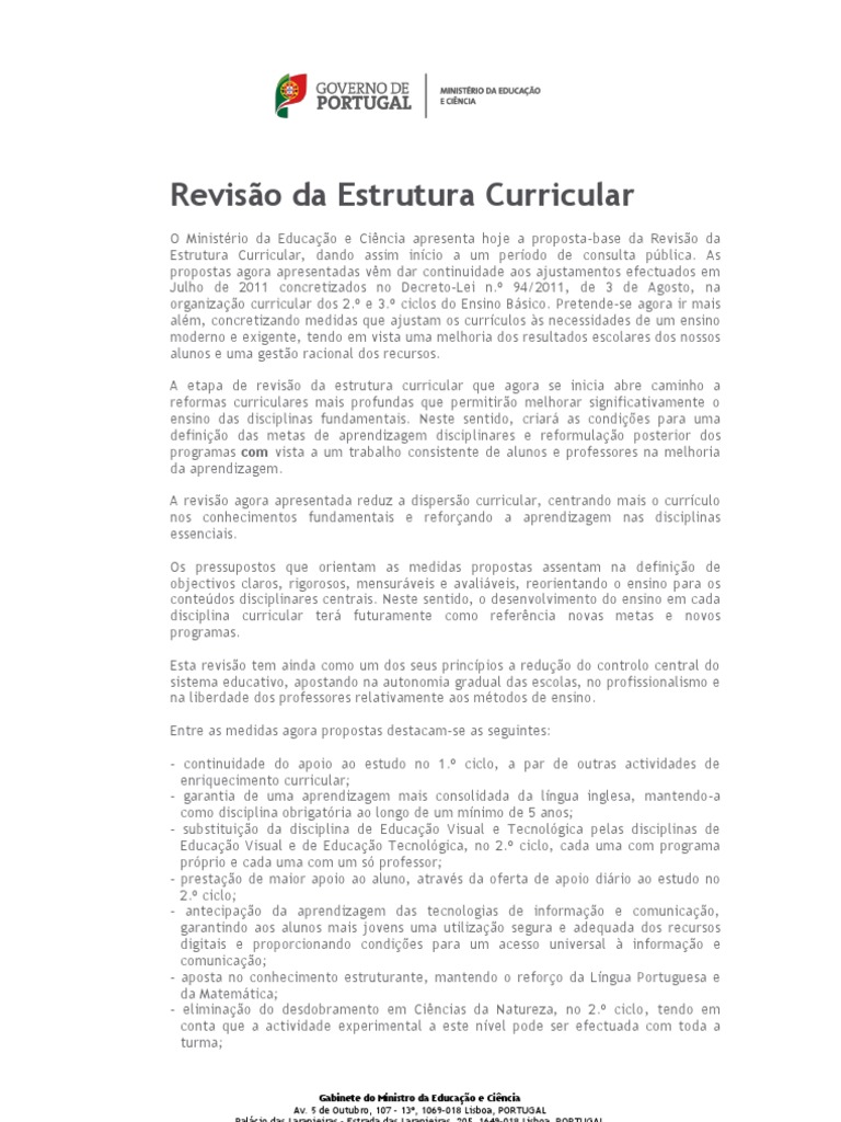 O Ministrio da Educao e Cincia apresenta hoje a proposta-base da Reviso da Estrutura Curricular, dando assim incio a um perodo de consulta pblica. As propostas agora apresentadas vm dar continuidade aos ajustamentos efectuados em Julho de 2011 concretizados no Decreto-Lei n. 94/2011, de 3 de Agosto, na organizao curricular dos 2. e 3. ciclos do Ensino Bsico. Pretende-se agora ir mais alm, concretizando medidas que ajustam os currculos s necessidades de um ensino moderno e exigente, tendo em vista uma melhoria dos resultados escolares dos nossos alunos e uma gesto racional dos recursos. A etapa de reviso da estrutura curricular que agora se inicia abre caminho a reformas curriculares mais profundas que permitiro melhorar significativamente o ensino das disciplinas fundamentais. Neste sentido, criar as condies para uma definio das metas de aprendizagem disciplinares e reformulao posterior dos programas com vista a um trabalho consistente de alunos e professores na melhoria da aprendizagem. A reviso agora apresentada reduz a disperso curricular, centrando mais o currculo nos conhecimentos fundamentais e reforando a aprendizagem nas disciplinas essenciais. Os pressupostos que orientam as medidas propostas assentam na definio de objectivos claros, rigorosos, mensurveis e avaliveis, reorientando o ensino para os contedos disciplinares centrais. Neste sentido, o desenvolvimento do ensino em cada disciplina curricular ter futuramente como referncia novas metas e novos programas. Esta reviso tem ainda como um dos seus princpios a reduo do controlo central do sistema educativo, apostando na autonomia gradual das escolas, no profissionalismo e na liberdade dos professores relativamente aos mtodos de ensino. Entre as medidas agora propostas destacam-se as seguintes: - continuidade do apoio ao estudo no 1. ciclo, a par de outras actividades de enriquecimento curricular; - garantia de uma aprendizagem mais consolidada da lngua inglesa, mantendo-a como disciplina obrigatria ao longo de um mnimo de 5 anos; - substituio da disciplina de Educao Visual e Tecnolgica pelas disciplinas de Educao Visual e de Educao Tecnolgica, no 2. ciclo, cada uma com programa prprio e cada uma com um s professor; - prestao de maior apoio ao aluno, atravs da oferta de apoio dirio ao estudo no 2. ciclo; - antecipao da aprendizagem das tecnologias de informao e comunicao, garantindo aos alunos mais jovens uma utilizao segura e adequada dos recursos digitais e proporcionando condies para um acesso universal informao e comunicao; - aposta no conhecimento estruturante, mantendo o reforo da Lngua Portuguesa e da Matemtica; - eliminao do desdobramento em Cincias da Natureza, no 2. ciclo, tendo em conta que a actividade experimental a este nvel pode ser efectuada com toda a turma;