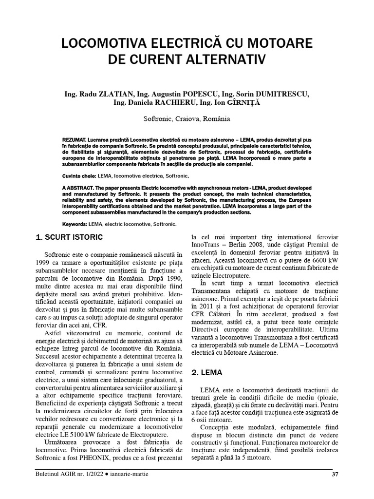 REZUMAT. Lucrarea prezintă Locomotiva electrică cu motoare asincrone – LEMA, produs dezvoltat și pus