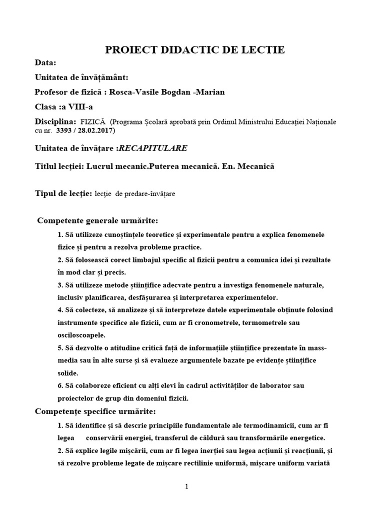 Titlul lecţiei: Lucrul [Link] mecanică. En. Mecanică