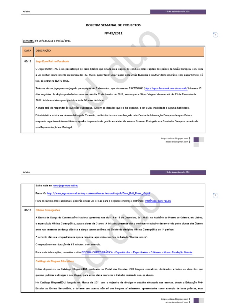 Saiba mais em www.jogo-euro-rail.eu Press Kit: http://www.jogo-euro-rail.eu/wp-content/themes/eurorails/pdf/Euro_Rail_Press_Kit.pdf Para esclarecimentos adicionais, podero enviar um e-mail para o seguinte endereo eletrnico: Info@jogo-euro-rail.eu 06/12 Oficina Coreogrfica A Escola de Dana do Conservatrio Nacional apresenta nos dias 14 e 15 de Dezembro, s 19h30, no Auditrio do Museu do Oriente, em Lisboa, o espectculo Oficina Coreogrfica, para maiores de 3 anos. A iniciativa pretende dar a conhecer o trabalho desenvolvido pelos alunos dos ltimos anos nas vertentes de dana clssica e dana contempornea, no mbito da disciplina Oficina Coreogrfica do 1. perodo. A vertente clssica, enquadrada na poca natalcia, apresenta excertos do bailado Quebra-nozes. O espectculo tem durao de 65 minutos, com intervalo. Para mais informaes, consultar o stio OFICINA COREOGRFICA - Espectculos - Espectculos - O Museu - Museu Fundao Oriente. Catlogo de Blogues Educativos Esto disponveis no Catlogo BloguesEDU, publicado no Portal das Escolas, 200 blogues educativos, destinados a todos os docentes que queiram publicar e divulgar o seu blogue, para assim dar a conhecer o trabalho realizado com os alunos. No Catlogo BloguesEDU, lanado em Maro de 2011 com o objectivo de divulgar o trabalho efectuado nas escolas, desde a Educao PrEscolar ao Ensino Secundrio, o docente tem acesso no s aos blogues a existentes, apresentados como exemplo de boas prticas, mas