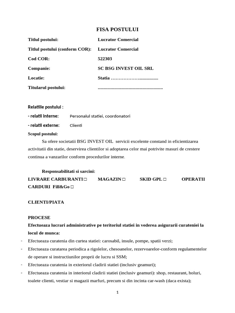 INVEST OIL in vigoare la data emiterii fisei de post si oricare alta revizie a acesteia precum