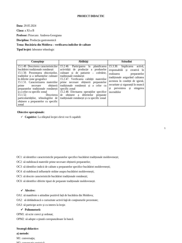OC1: să identifice caracteristicile preparatelor specifice bucătăriei tradiționale moldovenești;