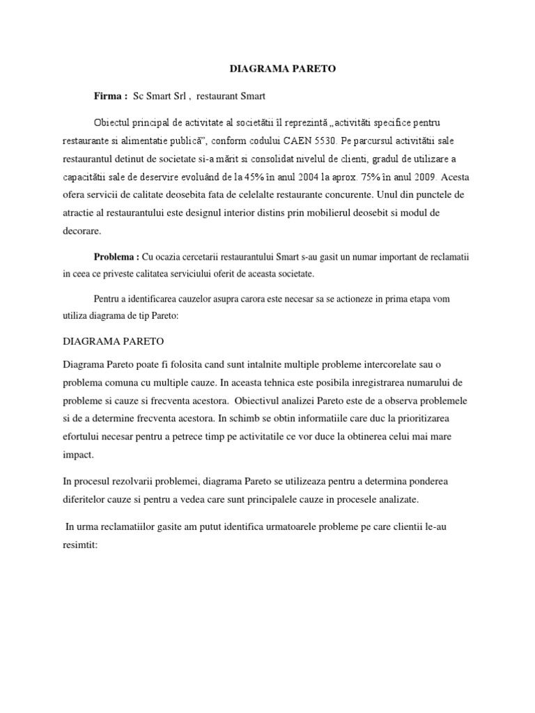 DIAGRAMA PARETO Firma : Sc Smart Srl , restaurant Smart Obiectul principal de activitate al societtii l reprezint activitti specifice pentru
