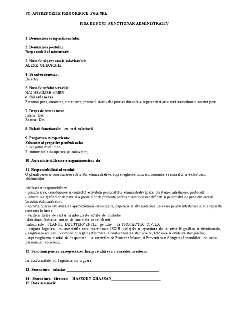 SC ANTREPOZITE FRIGORIFICE PGA SRL FISA DE POST FUNCTIONAR ADMINISTRATIV