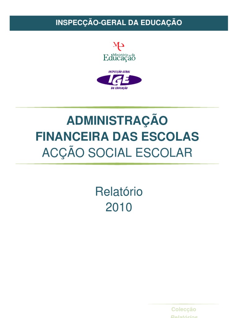 Ttulo Administrao Financeira das Escolas: Aco Social Escolar 2010 Relatrio Autoria Inspeco-Geral da Educao Elaborao: Jos da Silva Santos Coleco Relatrios Edio Inspeco-Geral da Educao (IGE) Av. 24 de Julho, 136 1350346 LISBOA Tel.: 213 924 800 / 213 924 801 Fax: 213 924 950 / 213 924 960 e-mail: ige@ige.min-edu.pt URL: http://www.ige.min-edu.pt Coordenao editorial, copidesque, design grfico, reviso tipogrfica e divulgao IGE Diviso de Comunicao e Documentao (DCD) Novembro 2011