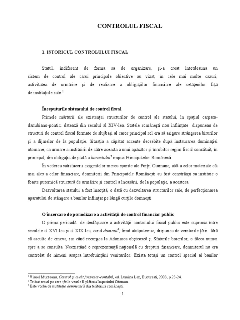 sistem de control ale crui principale obiective au vizat, n cele mai multe cazuri, de urmrire de realizare financiare de instituiile sale.1 nceputurile sistemului de control fiscal Primele mrturii ale existenei structurilor de control ale statului, n spaiul carpatodanubiano-pontic, dateaz din secolul al XIV-lea. Statele romneti nou nfiinate dispuneau de structuri de control fiscal formate de slujbai al caror principal rol era s asigure strngerea birurilor i a dijmelor de la populaie. Situaia a cptat accente deosebite dup instaurarea dominaiei otomane, ca urmare a instituirii de ctre aceasta a unui apstor i nrobitor regim fiscal constituit, n principal, din obligaia de plat a haraciului2 impus Principatelor Romnesti. n vederea satisfacerii exigentelor mereu sporite ale Porii Otomane, att a celor materiale ct mai ales a celor financiare, domnitorii din Principatele Romneti au fost constrni sa instituie o foarte puternic structur de urmrire i control a ncasrii, de la populaie, a acestora. Dezvoltarea statului a fost nsoit, o dat cu dezvoltarea structurilor sale, de perfecionarea aparatului de stngere a banilor nfiinat pe lng curile domneti. O ncercare de periodizare a activitii de control financiar public O prima perioad de desfurare a activitii controlului fiscal public este cuprinsa ntre secolele al XVI-lea i al XIX-lea, cand domnul3, fiind atotputernic, dispunea de veniturile rii fr s asculte de cineva, iar cnd recurgea la Adunarea obteasc i Sfaturile boierilor, o fcea numai spre a se consulta. Neexistnd o reprezentan naional cu drepturi financiare, domnitorul nu era controlat de nimeni asupra ntrebuinrii veniturilor. Exista totui un control special al banilor