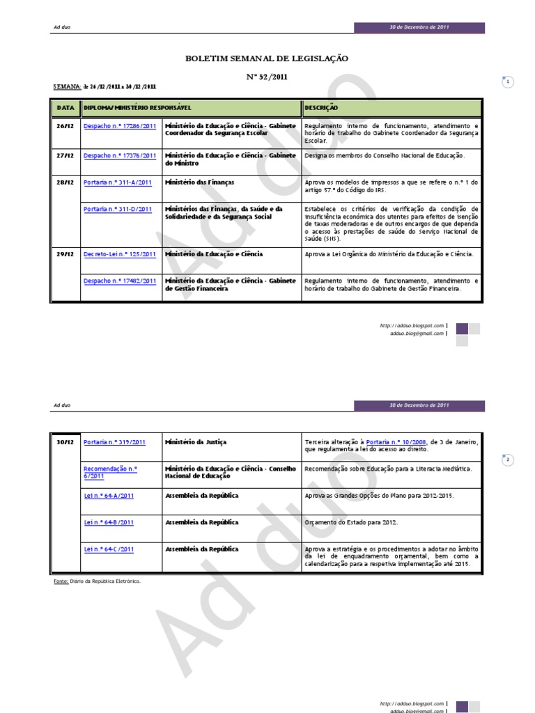 SEMANA: de 26/12/2011 a 30/12/2011 DATA 26/12 DIPLOMA/ MINISTRIO RESPONSVEL Despacho n. 17286/2011 Ministrio da Educao e Cincia - Gabinete Coordenador da Segurana Escolar Ministrio da Educao e Cincia - Gabinete do Ministro Ministrio das Finanas DESCRIO Regulamento interno de funcionamento, atendimento e horrio de trabalho do Gabinete Coordenador da Segurana Escolar. Designa os membros do Conselho Nacional de Educao.