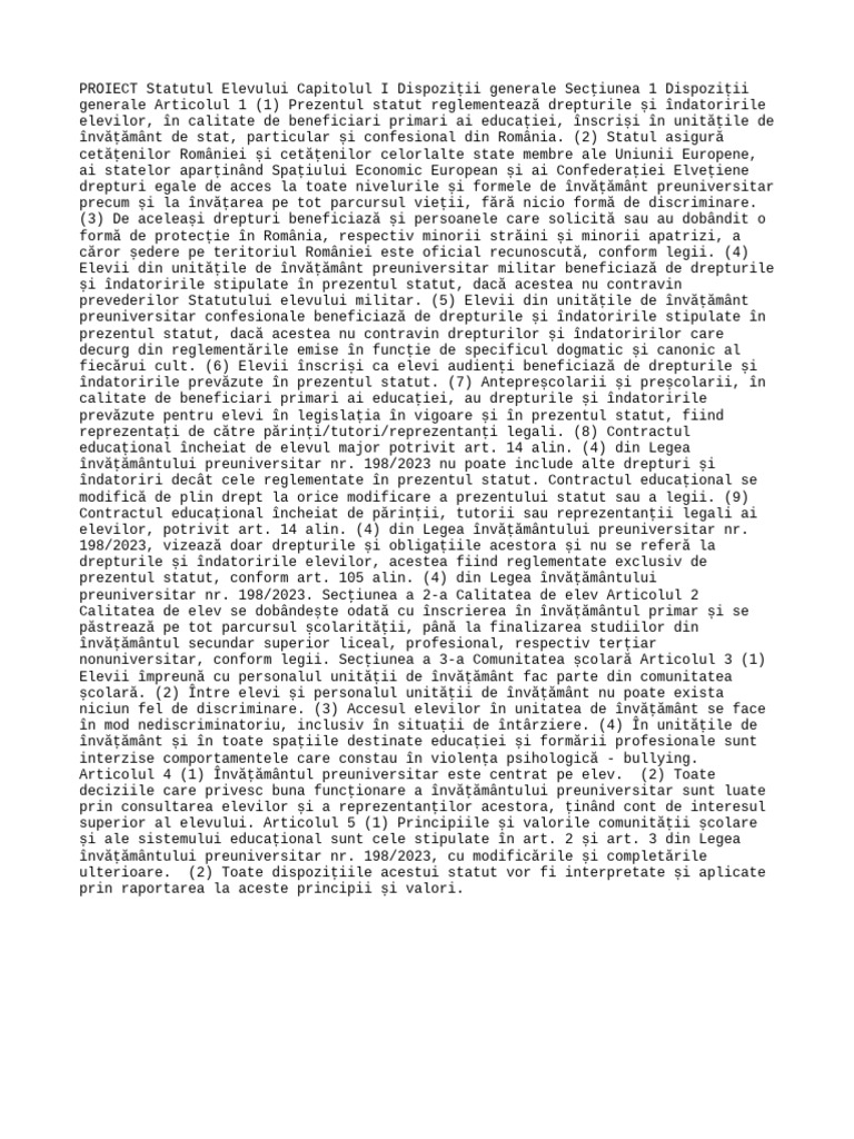 preuniversitar nr. 198/2023. Secţiunea a 2-a Calitatea de elev Articolul 2