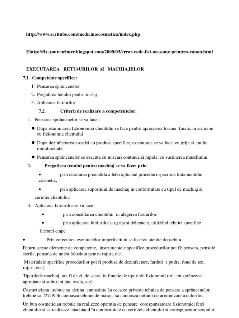 fiecareietape. Pentruacesteelementedecompetente,instrumentelespecificeprocedurilorpotfi:penseta,pensule sterile,pensuladeunicafolosintapentrurujuri,etc. Materialelespecificeprocedurilorpotfiprodusededezinfectare,farduri(pudre,fonddeten, rujuri,etc.) Tipuriledemachiajpotfidezi,desearainfunctiedetipuridefizionomii(ex.:cusprncene apropiatesisubtirisifataovala,etc) Cosmeticianatrebuiesadetinacunostintenceeaceprivestetehnicadepensareasprncenelor, trebuiesa727t195hcunoascatehnicidemasaj,sacunoascanotiunidearmonizareaculorilor. Unbuncosmeticiantrebuiesarealizezeoperatiadepensarecorespunzatoarefizionomieifetei clientuluisisarealizezemachiajulnconformitatecucerinteleclientuluisicorespunzatorscopului