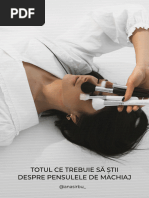 11)Pentrucaarmoniaculorilorsafiecompleta,eatrebuiesatinacontde: a)culoareaochilor, b)culoareaparului, c)culoareatenului, d)culoareapetelorcoloratedemachiaj(ruj,farddepleoape)siculoareatoaletei. 12)Rujuldebuze,farduldefatasilaculdeunghiitrebuiesaseasorteze. 13)Machiajulsemaipoateschimbadupaschimbarileocazionalealeculoriipielii:machiajpentru pielebronzata(nrositadevnt,cuperoza)saumachiajpentruofatapalidasiobosita. [Link] Dupaefectuareamachiajului,pentruntretinerealui,aplicatiuntampondevataumezitn aparece,sauuncubdeghiatainvelitintruntifonsitamponatiusorfata. Dacarujulnuesterezistent,buzeletrebuiepudratenaintedeaplicarearujului, Cremaantiridseaplicanjurulochilorsipetensensibil. Dupaoperatiuneadedemacherecuunlaptedemacheant,[Link] nlaturacuunservetel. Fonduldeten,sepoateaplicaegalpetoatafata,pepleoape,[Link] zisepoatealegeunfondnculoareatenului. Dupafolosireafonduluidetensepoateaplicafardulanticearcan,pentruestompareadefectelor. Chiardacacearcanelenuexistanmodobisnuit,elepotapareanperioadeledeobosealasisepot usoratenuaprinmachiaj. ntrebuintarea fardului corector n scopul corectarilor morfologice nu este recomandabila la [Link],diferenteledenuantesuntvizibilesi,departedeasiatingescopul fardulcorector,vordaimpresiaunorpeteinestetice. Farduldeobrazpoatefifolositziua. [Link],seaplicapudra. Cuperiutadesprncene,[Link] directii. [Link] subliniazaprintroliniecontinua,ciprinmaimulteliniutecaresaimitefireledeparabsente. Pentrumachiajuldezisevaevitaalegereaunuicreionnegru,[Link] preferabilecreioanlegrisaumaro. [Link],seaplicacupensulasiseestompeazacu mna,dacaestecompact,seaplicasiseestimpeazacupensula. [Link]. Pentruunmachiajsimplu,pentruzi,sepoaterenuntalacontur,folosindusedoarputinfardde pleoape. Lasfrsit,seaplicarujuldebuze,carepentruzisealegentroculoaremaideschisadectseara. Machiajuldesearaarecascopsadeastraluciresisascoatanevidentaaccenteletonicesau puncteleviialeobrazului,caresuntochiisigura.