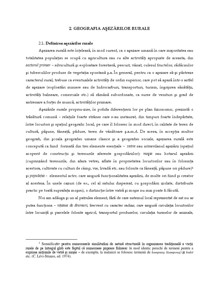 2.4.2. Tipologia dimensional a aezrilor rurale Dei diferenele dimensionale dintre aezrile rurale sunt mult mai mici dect acelea dintre aezrile urbane, totui se poate nregistra o gam de situaii care ne permite s distingem trei paliere dimensionale : [Link]. Cea mai mic aezare rural poate fi reprezentat de o gospodrie sau ferm izolat, situaie mai rar n Europa de Est dar extrem de comun n zonele de colonizare recent, din Australia, partea central-vestic a Americii de Nord, ca i n Europa oceanic; [Link]. Treapta median este aceea a ctunului, care, de regul, nu trece de un numr de 15 gospodrii dar n care, bine neles n funcie de standardul de via al populaiei, pe lng locuinele stenilor, pot s apar i unele dotri elementare coal, mic magazin universal, atelier de reparaii .a. La acelai nivel dimensional se situeaz aezrile-reedin ale marilor latifundii (haciendas din America hispanofon sau fazendas, din Brazilia), formate din locuina proprietarului, locuinele muncitorilor agricoli sau ale ranilor care lucreaz n arend, spaii de depozitare a produselor i seminelor, hangarul-atelier pentru mainile agricole, adposturi pentru animale etc. Asemntoare ca dimensiuni sunt sediile de ferme din agricultura etatizatcooperatist (din statele fostei U. R. S. S. .a.). [Link]. A treia treapt este aceea a satului propriu-zis, care, n mod obinuit, cuprinde peste 15 gospodrii, fr s poat fi precizat o limit superioar, deoarece sunt foarte mari diferene de la un stat la altul iar n unele regiuni sunt prezente sate gigantice, cu peste 10 mii de locuitori