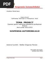 Elementele de amortizare mpreun cu-frecarea dintre foile arcurilor amortizeaz oscilaiile caroseriei i ale roilor. Funciile celor trei elemente principale ale suspensiei pot ti ndeplinite de unui i acelai element sau de elemente diferite. In unele cazuri, suspensia automobilului mai conine elemente supliment tare stabilizatoare, care au rol de a reduce nclinrile laterale ale autovehiculelor n viraje. Condiiile impuse. Suspensia automobilului trebuie s ndenhneasca urmtoarele condiii principale caracteristic elastic, care s asigure un grad de confort satisfctor; construcie simpl i rezistent; amortizarea vibraiilor caroseriei i roilor; asigurarea cinematicii corecte a mecanismului de direcie; greutatea minim; s transmit forele i momentele reactive de la roti la caroserie etc. Clasificarea suspensiilor. Clasificarea suspensiilor automobilelor se face dup tipul punii i dup caracteristica elementelpr elastice. Dup tipul punii, suspensiile se clasific: suspensii roi dependente suspensii cu roi independente. Suspensia cu roi dependente se ntlnete n cazul punilor rigide (fig. 1, a) iar suspensia cu roi independente, n cazul punilor articulate (fig. 1, b) la care fiecare roat este suspendat direct de cadru sau caroserie. Suspensia dependent este caracterizat printr-o legatura rigid intre roile din dreapta i din stnga , iar ridicarea sau coborrea unei roi , produs de denivelrile cii , provoac schimbarea poziiei i pentru cealalt roat La suspensia independent lipsete legtura directa dintre roile automobilului iar schimbarea poziiei unei roi nu influeneaz i cealalta roat . Suspensia independent prezint fa de suspensia dependent avantajele : inbuntairea confortului prin reducerea masei nesuspendate ; inuta de drum mai bun deoarece deplasrile roilor nu se influeneaz reciproc ; micorarea oscilaiilor de ruliu ale caroseriei i mrirea stabilitaii automobilului