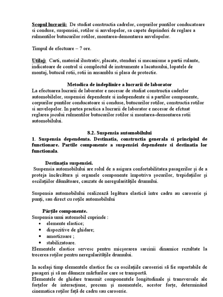 a rulmentilor butucurilor rotilor, montarea-demontarea anvelopelor. Timpul de efectuare 7 ore. Utilaj: Carti, material ilustrativ, placate, stenduri si mecanisme a partii rulante, indicatoare de control si complectul de instrumente a lacatusului, lopatele de montaj, butucul rotii, rotii in ansamblu si plasa de protectie. Metodica de indeplinire a lucrarii de laborator La efectuarea lucrarii de laborator e necesar de studiat constructia caderlor automobilelor, suspensiei dependente si independente si a partilor componente, corpurilor puntilor conducatoare si conduse, butucurilor rotilor, constructia rotilor si anvelopelor. In partea practica a lucrarii de laborator e necesar de efctuat reglarea jocului rulmentilor butucurilor rotilor si montarea-demontarea rotii automobilului. 8.2. Suspensia automobilului 1. Suspensia dependenta. Destinatia, constructia generala si principiul de functionare. Partile componente a suspensiei dependente si destinatia lor functionala. Destinaia suspensiei. Suspensia automobilului are rolul de a asigura confortabilitatea pasagerilor i de a proteja ncrctura i organele componente mpotriva ocurilor, trepidaiilor i oscilaiilor duntoare, cauzate de neregularitile drumului. Suspensia automobilului realizeaz legtura elastic ntre cadru au caroserie i puni, sau direct cu roile automobilului Prile componente. Suspensia unui automobil cuprinde : elemente elastice; dispozitive de ghidare; amortizoare ; stabilizatoare. Elementele elastice servesc pentru micorarea sarcinii dinamice rezultate la trecerea roilor pentru neregularitile drumului. In acelai timp elementele elastice fac ca oscilaiile caroseriei s fie suportabile de pasageri i s nu duneze mrfurilor care se transport. Elementele de ghidare transmit componentele longitudinale i transversale ale forelor de interaciune, precum i momentele, acestor fore, determinnd cinematica roilor fa de cadru sau caroserie.