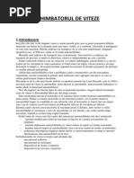 1.1. Scurt justificare a prezenei schimbtorului de viteze pe automobil Rezistenele la naintare ale autovehiculelor variaz mult n funcie de condiiile de deplasare corespunztoare acestora trebuind modificat i fora de traciune Majoritatea autovehiculelor actuale au ca surs de propulsie motorul cu ardere intern care permite o variaie limitat a momentului motor i deci implicit a forei de traciune. Din aceast cauz, autovehiculele echipate cu motoare cu ardere intern trebuiesc prevzute cu un schimbtor de viteze. Schimbtorul de vitez are rolul de a transforma cuplul i turaia motorului cu ardere intern astfel nct s se obin fora de traciune la roat necesar pornirii din loc a automobilului, atingerii vitezei maxime i nvingerii rezistenelor din partea drumului. Schimbtorul de vitez face posibil deplasarea n palier cu viteze reduse, ceea ce motorul cu ardere intern nu poate face, din cauza c nu poate funciona la o turaie mai mic dect turaia minim stabil de funcionare. Deasemenea permite schimbarea sensului de mers al automobilului, decuplarea prelungit a motorului de transmisie la pornirea motorului. Schimbtorul de vitez trebuie sa permit automobilului s urce panta maxim stabilit n tema de proiectare cu vitez constant, acest lucru realizndu-se printr-un raport de transmitere ce asigur o for de traciune la roat suficient de mare pentru nvingerea rezistenei la pant.