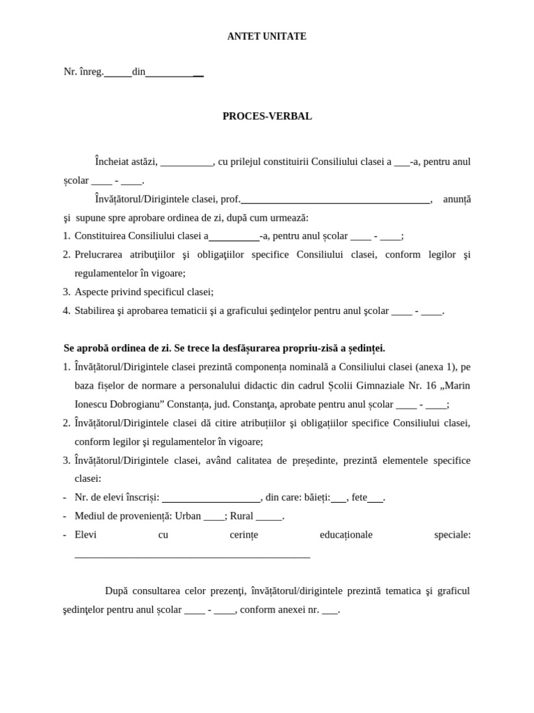 Încheiat astăzi, __________, cu prilejul constituirii Consiliului clasei a ___-a, pentru anul