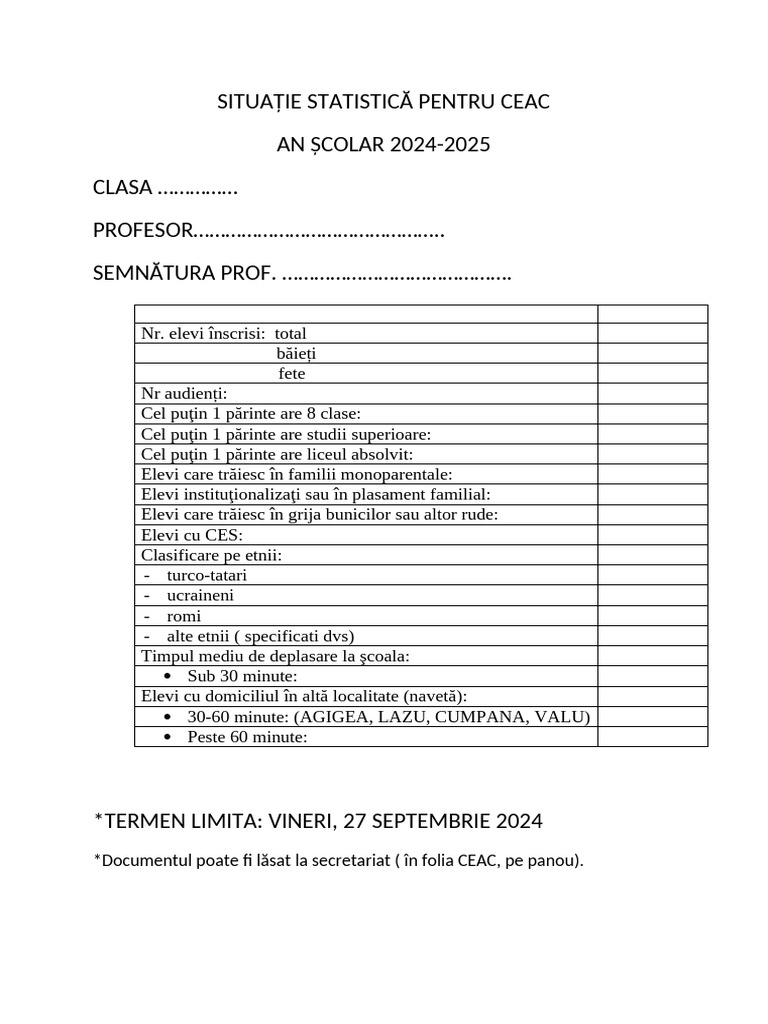 *Documentul poate fi lăsat la secretariat ( în folia CEAC, pe panou).