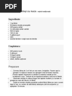 Avem nevoie de: -300g cascaval dat pe razatoarea mica -250 g unt(200 se baga in cascaval iar 50 se amesteca cu pateul) - condimente -muraturi (gogosar, castrevete) -2 oua fierte tari Se amesteca cascavalul ras prin razatoarea mica cu untul/margarina,se pun condimentele,se face o pasta uniforma, se intinde o folie de celofan,se unge putin cu ulei se intinde (cu mana)in strat uniform. Deasupra peste pasta se intinde o cutie de pateu de ficat amestecat cu piper,unt muratura(castravete si gogosar) .Deasupra se pun 1-2 oua fierte tare si taiate [Link] ruleaza se infasoara totul in celofan se lasa la rece de pe o zi pe alta. Se serveste taiata rond