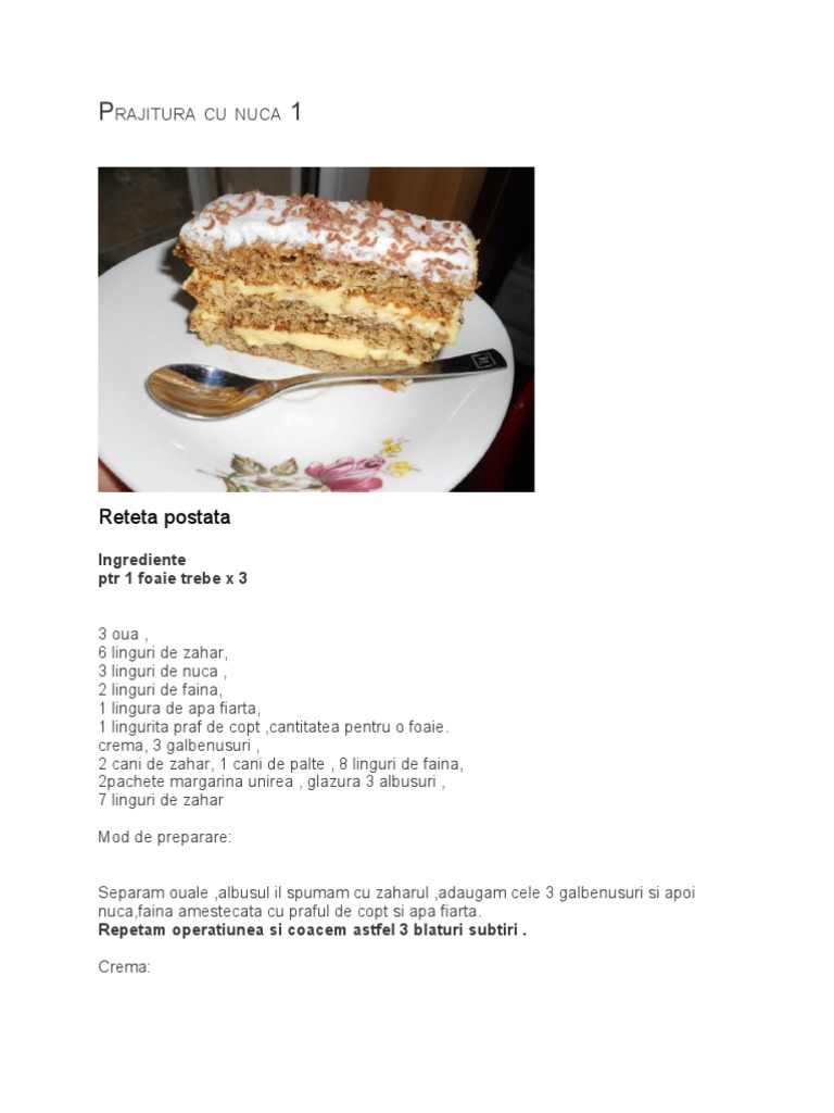 Ingrediente ptr 1 foaie trebe x 3 3 oua , 6 linguri de zahar, 3 linguri de nuca , 2 linguri de faina, 1 lingura de apa fiarta, 1 lingurita praf de copt ,cantitatea pentru o foaie. crema, 3 galbenusuri , 2 cani de zahar, 1 cani de palte , 8 linguri de faina, 2pachete margarina unirea , glazura 3 albusuri , 7 linguri de zahar Mod de preparare: Separam ouale ,albusul il spumam cu zaharul ,adaugam cele 3 galbenusuri si apoi nuca,faina amestecata cu praful de copt si apa fiarta. Repetam operatiunea si coacem astfel 3 blaturi subtiri . Crema: