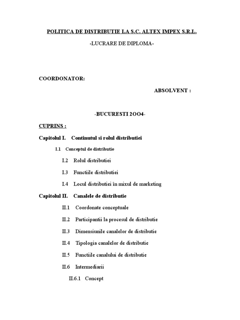 II.9 Distributia fizica (logistica) Capitolul III. Prezentare generala a S.C. ALTEX IMPEX S.R.L. III.1 Prezentare generala si descrierea obiectului de activitate III.2 Misiunea firmei ALTEX