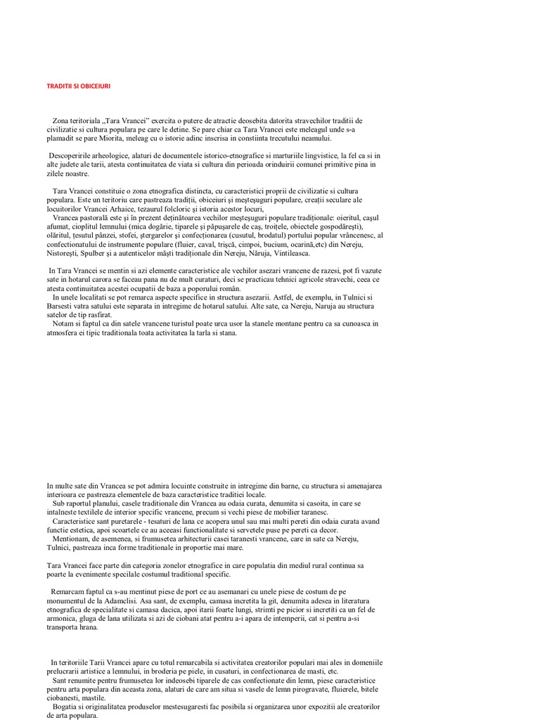 Zona teritoriala Tara Vrancei exercita o putere de atractie deosebita datorita stravechilor traditii de civilizatie si cultura populara pe care le detine. Se pare chiar ca Tara Vrancei este meleagul unde s-a plamadit se pare Miorita, meleag cu o istorie adinc inscrisa in constiinta trecutului neamului. Descoperirile arheologice, alaturi de documentele istorico-etnografice si marturiile lingvistice, la fel ca si in alte judete ale tarii, atesta continuitatea de viata si cultura din perioada orinduirii comunei primitive pina in zilele noastre. Tara Vrancei constituie o zona etnografica distincta, cu caracteristici proprii de civilizatie si cultura populara. Este un teritoriu care pastreaza tradi ii, obiceiuri i me te uguri populare, crea ii seculare ale locuitorilor Vrancei Arhaice, tezaurul folcloric i istoria acestor locuri, Vrancea pastoral este i n prezent de in toarea vechilor me te uguri populare tradi ionale: oieritul, ca ul afumat, cioplitul lemnului (mica dog rie, tiparele i p pu arele de ca , troi ele, obiectele gospod re ti), ol ritul, esutul pnzei, stofei, tergarelor i confec ionarea (cusutul, brodatul) portului popular vrncenesc, al confectionatului de instrumente populare (fluier, caval, tri c , cimpoi, bucium, ocarin ,etc) din Nereju, Nistore ti, Spulber i a autenticelor m ti tradi ionale din Nereju, N ruja, Vintileasca. In Tara Vrancei se mentin si azi elemente caracteristice ale vechilor asezari vrancene de razesi, pot fi vazute sate in hotarul carora se faceau pana nu de mult curaturi, deci se practicau tehnici agricole stravechi, ceea ce atesta continuitatea acestei ocupatii de baza a poporului romn. In unele localitati se pot remarca aspecte specifice in structura asezarii. Astfel, de exemplu, in Tulnici si Barsesti vatra satului este separata in intregime de hotarul satului. Alte sate, ca Nereju, Naruja au structura satelor de tip rasfirat. Notam si faptul ca din satele vrancene turistul poate urca usor la stanele montane pentru ca sa cunoasca in atmosfera ei tipic traditionala toata activitatea la tarla si stana.