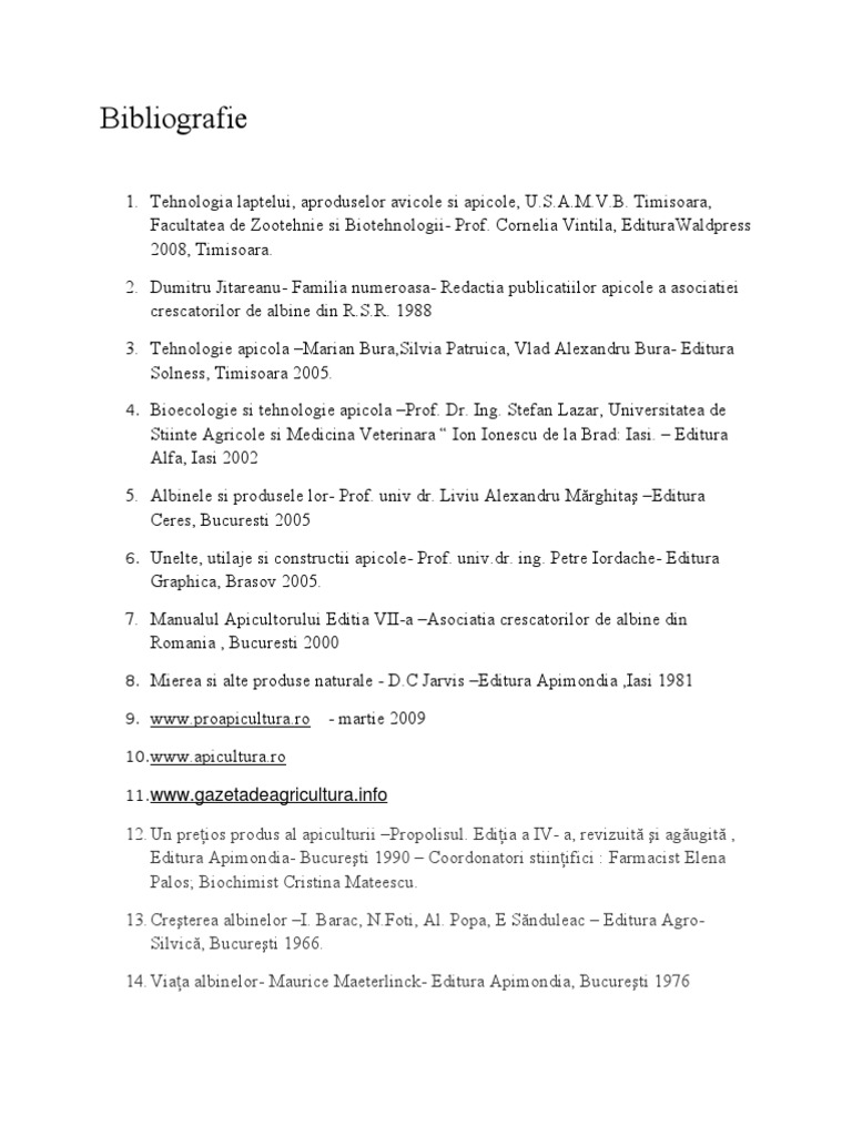 12. Un preios produs al apiculturii Propolisul. Ediia a IV- a, revizuit i agugit , Editura Apimondia- Bucureti 1990 Coordonatori stiinifici : Farmacist Elena Palos; Biochimist Cristina Mateescu. 13. Creterea albinelor I. Barac, [Link], Al. Popa, E Snduleac Editura AgroSilvic, Bucureti 1966. 14. Viaa albinelor- Maurice Maeterlinck- Editura Apimondia, Bucureti 1976