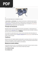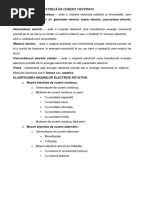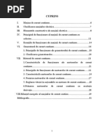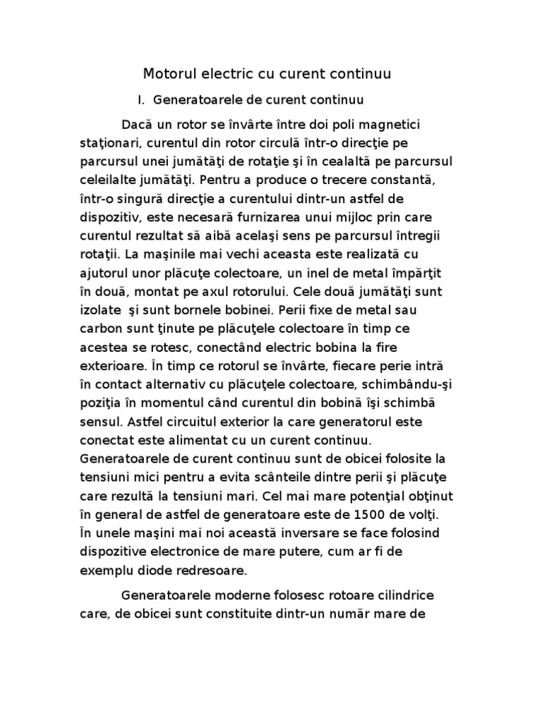 I. Generatoarele de curent continuu Dac un rotor se nvrte ntre doi poli magnetici staionari, curentul din rotor circul ntr-o direcie pe parcursul unei jumti de rotaie i n cealalt pe parcursul celeilalte jumti. Pentru a produce o trecere constant, ntr-o singur direcie a curentului dintr-un astfel de dispozitiv, este necesar furnizarea unui mijloc prin care curentul rezultat s aib acelai sens pe parcursul ntregii rotaii. La mainile mai vechi aceasta este realizat cu ajutorul unor plcue colectoare, un inel de metal mprit n dou, montat pe axul rotorului. Cele dou jumti sunt izolate i sunt bornele bobinei. Perii fixe de metal sau carbon sunt inute pe plcuele colectoare n timp ce acestea se rotesc, conectnd electric bobina la fire exterioare. n timp ce rotorul se nvrte, fiecare perie intr n contact alternativ cu plcuele colectoare, schimbndu-i poziia n momentul cnd curentul din bobin i schimb sensul. Astfel circuitul exterior la care generatorul este conectat este alimentat cu un curent continuu. Generatoarele de curent continuu sunt de obicei folosite la tensiuni mici pentru a evita scnteile dintre perii i plcue care rezult la tensiuni mari. Cel mai mare potenial obinut n general de astfel de generatoare este de 1500 de voli. n unele maini mai noi aceast inversare se face folosind dispozitive electronice de mare putere, cum ar fi de exemplu diode redresoare. Generatoarele moderne folosesc rotoare cilindrice care, de obicei sunt constituite dintr-un numr mare de