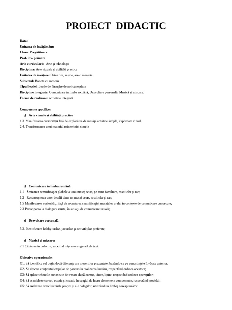 Discipline integrate: Comunicare în limba română, Dezvoltare personală, Muzică și mișcare.