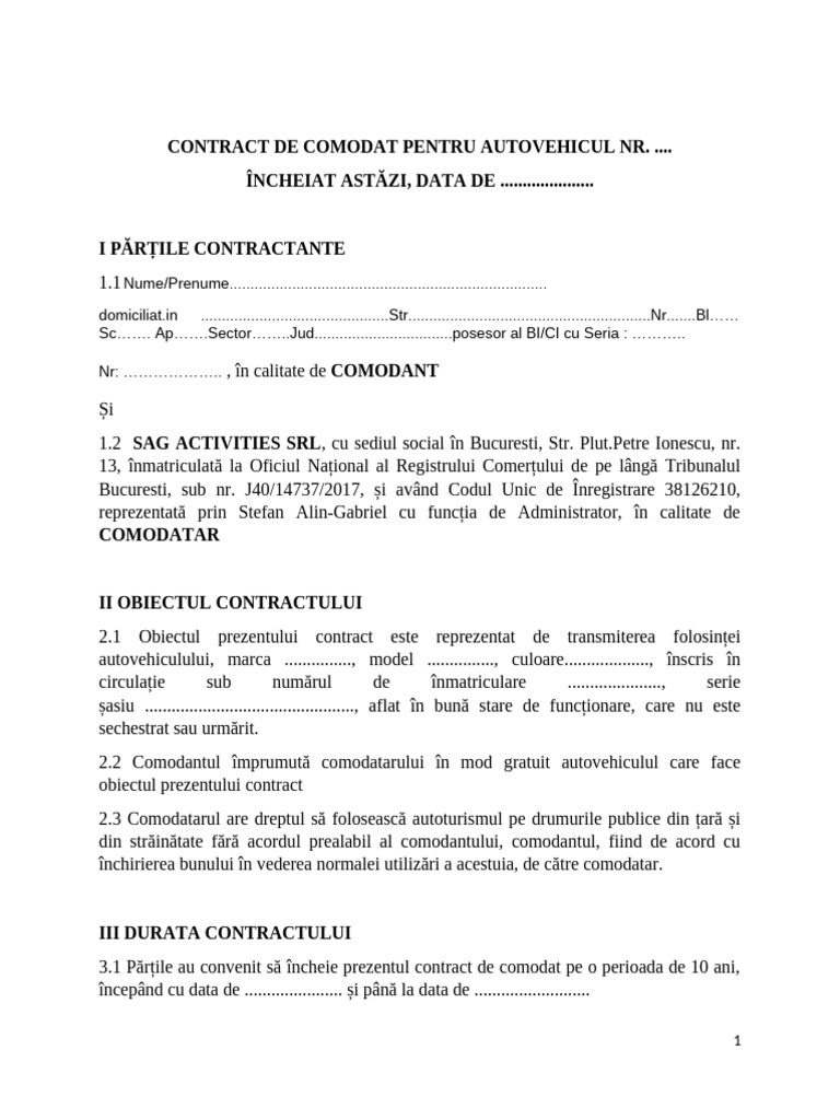 CONTRACT DE COMODAT PENTRU AUTOVEHICUL NR. ....