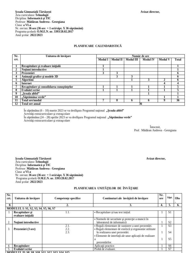 Nr. ore/an: 36 ore (36 ore = 1 oră/săpt. X 36 săptămâni)