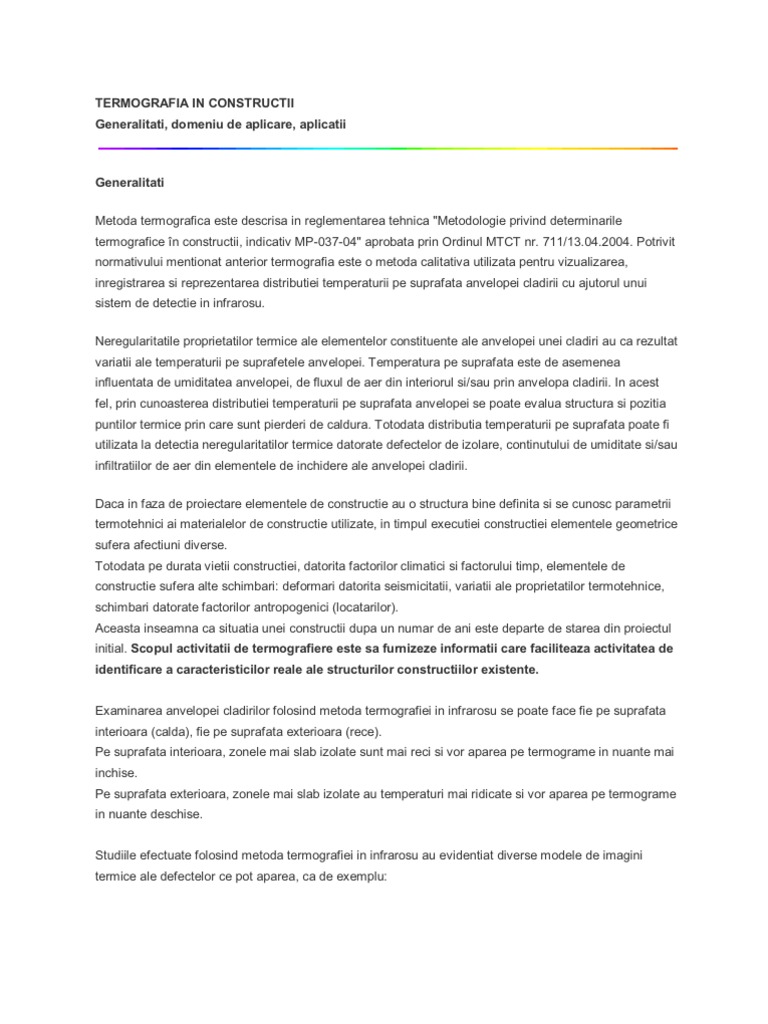 Generalitati Metoda termografica este descrisa in reglementarea tehnica "Metodologie privind determinarile termografice n constructii, indicativ MP-037-04" aprobata prin Ordinul MTCT nr. 711/13.04.2004. Potrivit normativului mentionat anterior termografia este o metoda calitativa utilizata pentru vizualizarea, inregistrarea si reprezentarea distributiei temperaturii pe suprafata anvelopei cladirii cu ajutorul unui sistem de detectie in infrarosu. Neregularitatile proprietatilor termice ale elementelor constituente ale anvelopei unei cladiri au ca rezultat variatii ale temperaturii pe suprafetele anvelopei. Temperatura pe suprafata este de asemenea influentata de umiditatea anvelopei, de fluxul de aer din interiorul si/sau prin anvelopa cladirii. In acest fel, prin cunoasterea distributiei temperaturii pe suprafata anvelopei se poate evalua structura si pozitia puntilor termice prin care sunt pierderi de caldura. Totodata distributia temperaturii pe suprafata poate fi utilizata la detectia neregularitatilor termice datorate defectelor de izolare, continutului de umiditate si/sau infiltratiilor de aer din elementele de inchidere ale anvelopei cladirii. Daca in faza de proiectare elementele de constructie au o structura bine definita si se cunosc parametrii termotehnici ai materialelor de constructie utilizate, in timpul executiei constructiei elementele geometrice sufera afectiuni diverse. Totodata pe durata vietii constructiei, datorita factorilor climatici si factorului timp, elementele de constructie sufera alte schimbari: deformari datorita seismicitatii, variatii ale proprietatilor termotehnice, schimbari datorate factorilor antropogenici (locatarilor). Aceasta inseamna ca situatia unei constructii dupa un numar de ani este departe de starea din proiectul initial. Scopul activitatii de termografiere este sa furnizeze informatii care faciliteaza activitatea de identificare a caracteristicilor reale ale structurilor constructiilor existente. Examinarea anvelopei cladirilor folosind metoda termografiei in infrarosu se poate face fie pe suprafata interioara (calda), fie pe suprafata exterioara (rece). Pe suprafata interioara, zonele mai slab izolate sunt mai reci si vor aparea pe termograme in nuante mai inchise. Pe suprafata exterioara, zonele mai slab izolate au temperaturi mai ridicate si vor aparea pe termograme in nuante deschise. Studiile efectuate folosind metoda termografiei in infrarosu au evidentiat diverse modele de imagini termice ale defectelor ce pot aparea, ca de exemplu: