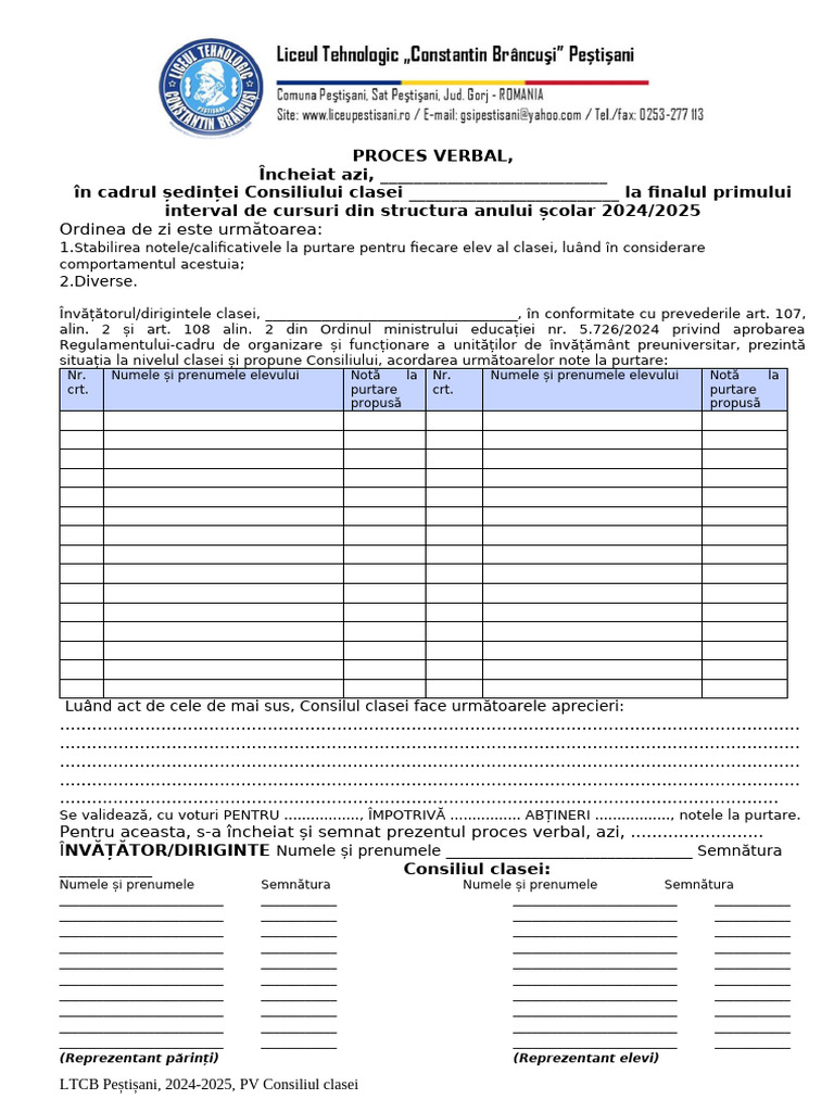 LTCB Peștișani, 2024-2025, PV Consiliul clasei