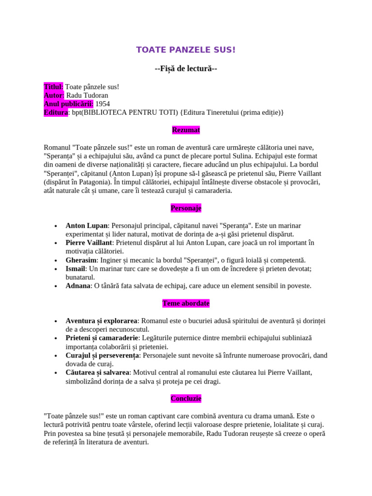 Romanul "Toate pânzele sus!" este un roman de aventură care urmărește călătoria unei nave,