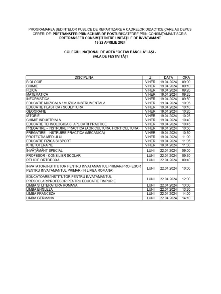 PROGRAMAREA ȘEDINȚELOR PUBLICE DE REPARTIZARE A CADRELOR DIDACTICE CARE AU DEPUS