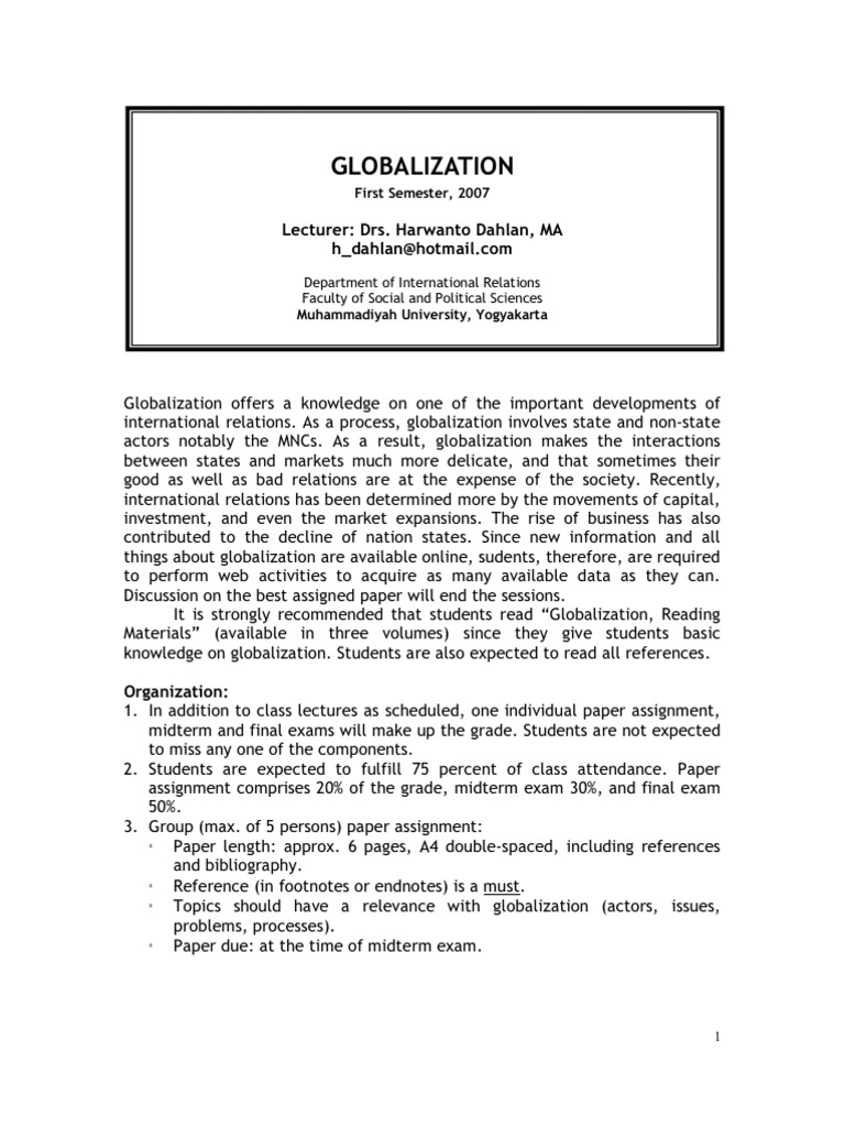 Globalization offers a knowledge on one of the important developments of international relations. As a process, globalization involves state and non-state actors notably the MNCs. As a result, globalization makes the interactions between states and markets much more delicate, and that sometimes their good as well as bad relations are at the expense of the society. Recently, international relations has been determined more by the movements of capital, investment, and even the market expansions. The rise of business has also contributed to the decline of nation states. Since new information and all things about globalization are available online, sudents, therefore, are required to perform web activities to acquire as many available data as they can. Discussion on the best assigned paper will end the sessions. It is strongly recommended that students read Globalization, Reading Materials (available in three volumes) since they give students basic knowledge on globalization. Students are also expected to read all references. Organization: 1. In addition to class lectures as scheduled, one individual paper assignment, midterm and final exams will make up the grade. Students are not expected to miss any one of the components. 2. Students are expected to fulfill 75 percent of class attendance. Paper assignment comprises 20% of the grade, midterm exam 30%, and final exam 50%. 3. Group (max. of 5 persons) paper assignment: Paper length: approx. 6 pages, A4 double-spaced, including references and bibliography. Reference (in footnotes or endnotes) is a must. Topics should have a relevance with globalization (actors, issues, problems, processes). Paper due: at the time of midterm exam.