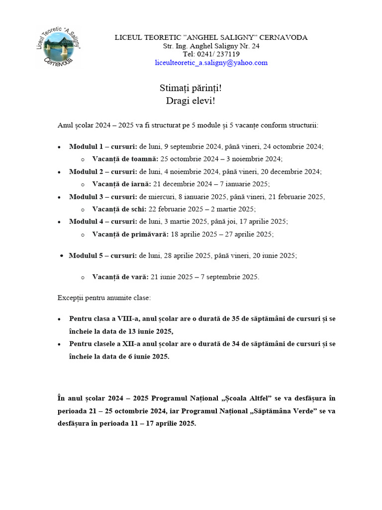 Anul școlar 2024 – 2025 va fi structurat pe 5 module și 5 vacanțe conform structurii: