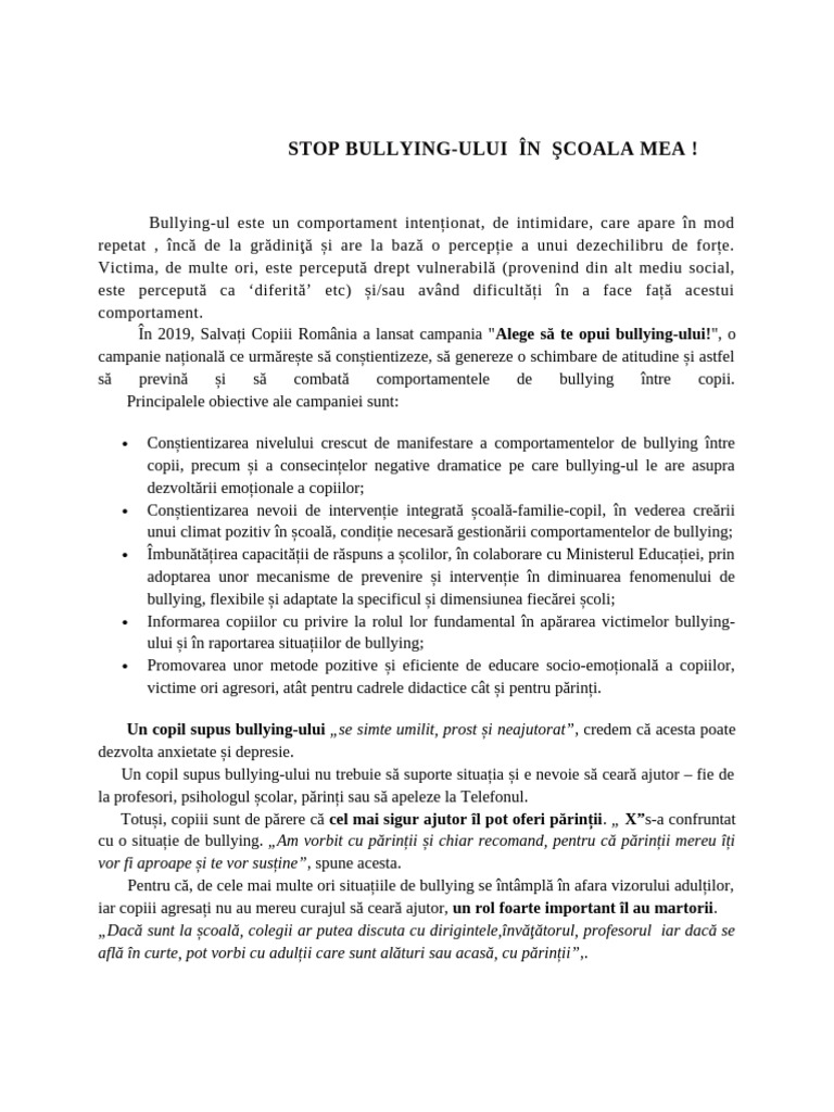 STOP BULLYING-ULUI ÎN ŞCOALA MEA !