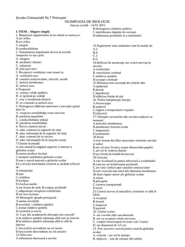 1. Răspunsul organismului la un stimul se numeș te: [Link] perilimfei si a endolimfei