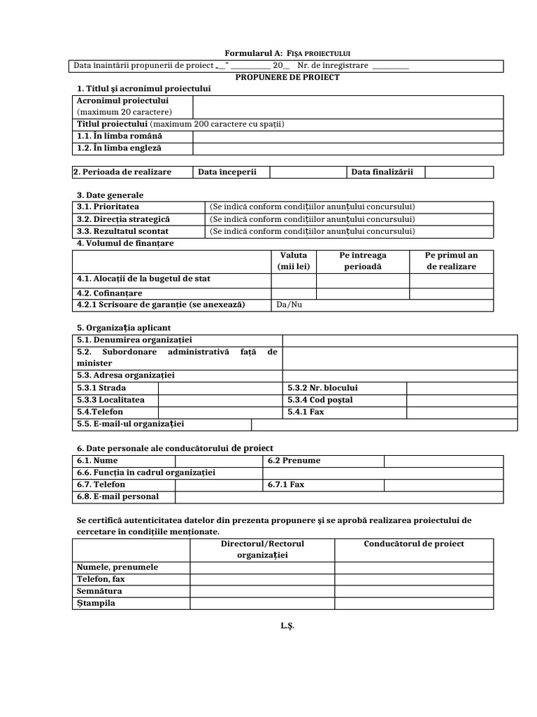 Data înaintării propunerii de proiect „__” ____________ 20__ Nr. de înregistrare ___________