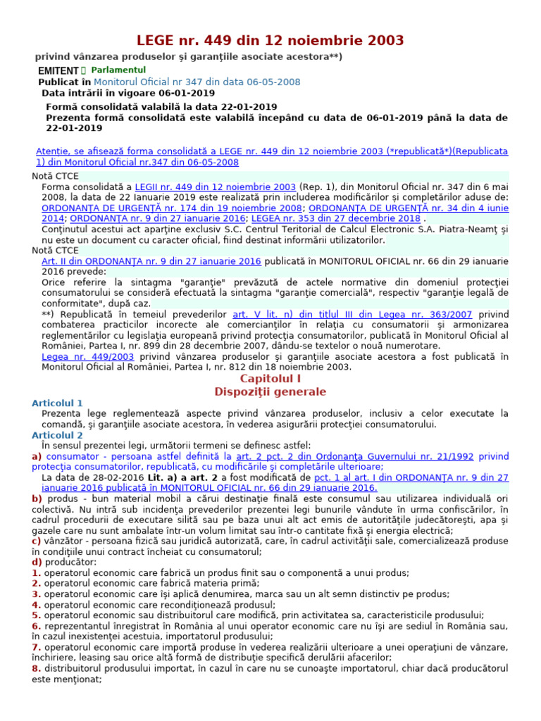 Legea nr. 449/2003 privind vânzarea produselor şi garanţiile asociate acestora a fost publicată în