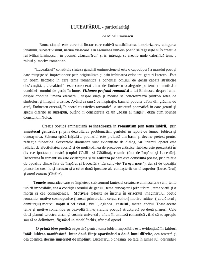 lui Mihai Eminescu , în poemul „Luceafărul” și în întreaga sa creație unde valorifică teme ,