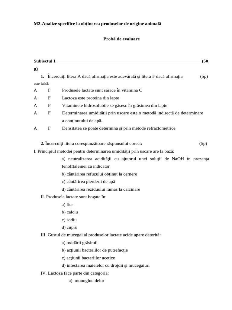 1. Încercuiţi litera A dacă afirmaţia este adevărată şi litera F dacă afirmaţia (5p)