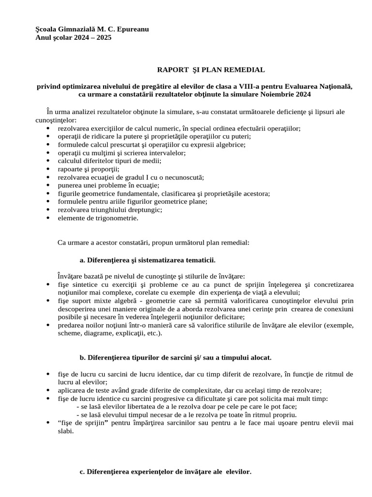 Ca urmare a acestor constatări, propun următorul plan remedial: