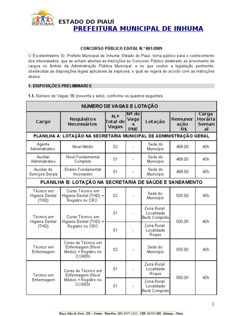 O Excelentssimo Sr. Prefeito Municipal de Inhuma, Estado do Piau, torna pblico para o conhecimento dos interessados, que se acham abertas as inscries ao Concurso Pblico destinado ao provimento de cargos no mbito da Administrao Pblica Municipal, e no que couber a legislao pertinente, obedecidas as disposies legais aplicveis s espcies, o qual se reger de acordo com as instrues abaixo: 1- DISPOSIES PRELIMINARES 1.1. Nmero de Vagas: 96 (noventa e sete), conforme os quadros seguintes: