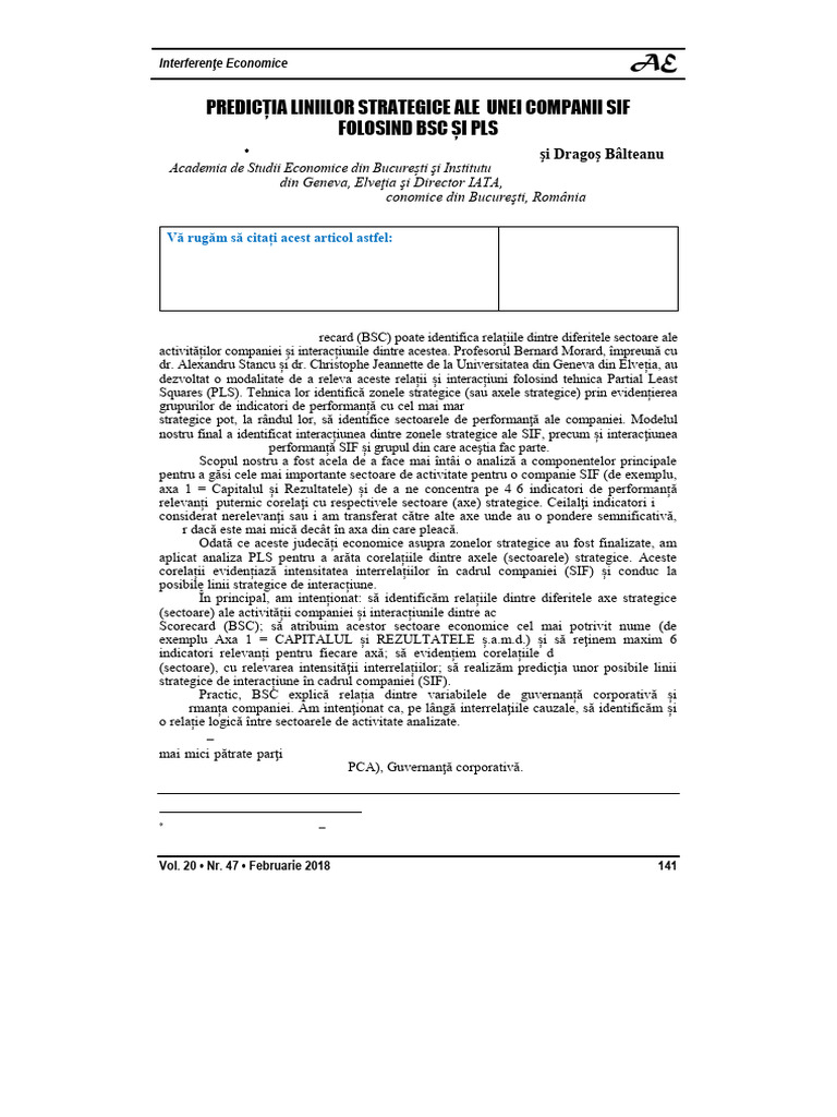 Cuvinte–cheie: Sectoare (axe) strategice, Balanced Scorecard (BSC), Regresia prin cele