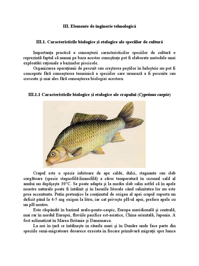 Caracteristicile biologice i etologice ale speciilor de cultur Importana practic a cunoaterii caracteristicilor speciilor de cultur o reprezint faptul c numai pe baza acestor cunotine pot fi elaborate metodele unei exploatri raionale a bazinelor piscicole. Organizarea operaiunii de pescuit sau creterea petilor n heleteie nu pot fi concepute fr cunoaterea temeinic a speciilor care urmeaz a fi pescuite sau crescute i mai ales fr cunoaterea biologiei acestora. III.1.1 Caracteristicile biologice i etologice ale crapului (Cyprinus carpio)