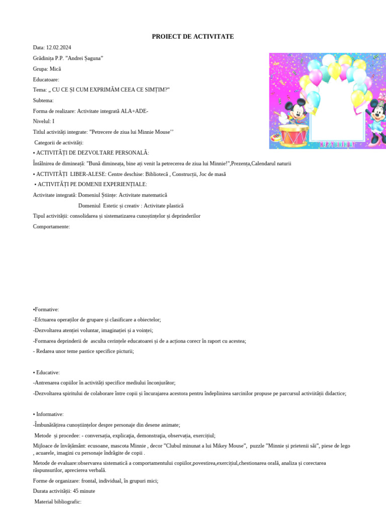 Titlul activități integrate: ”Petrecere de ziua lui Minnie Mouse’’
