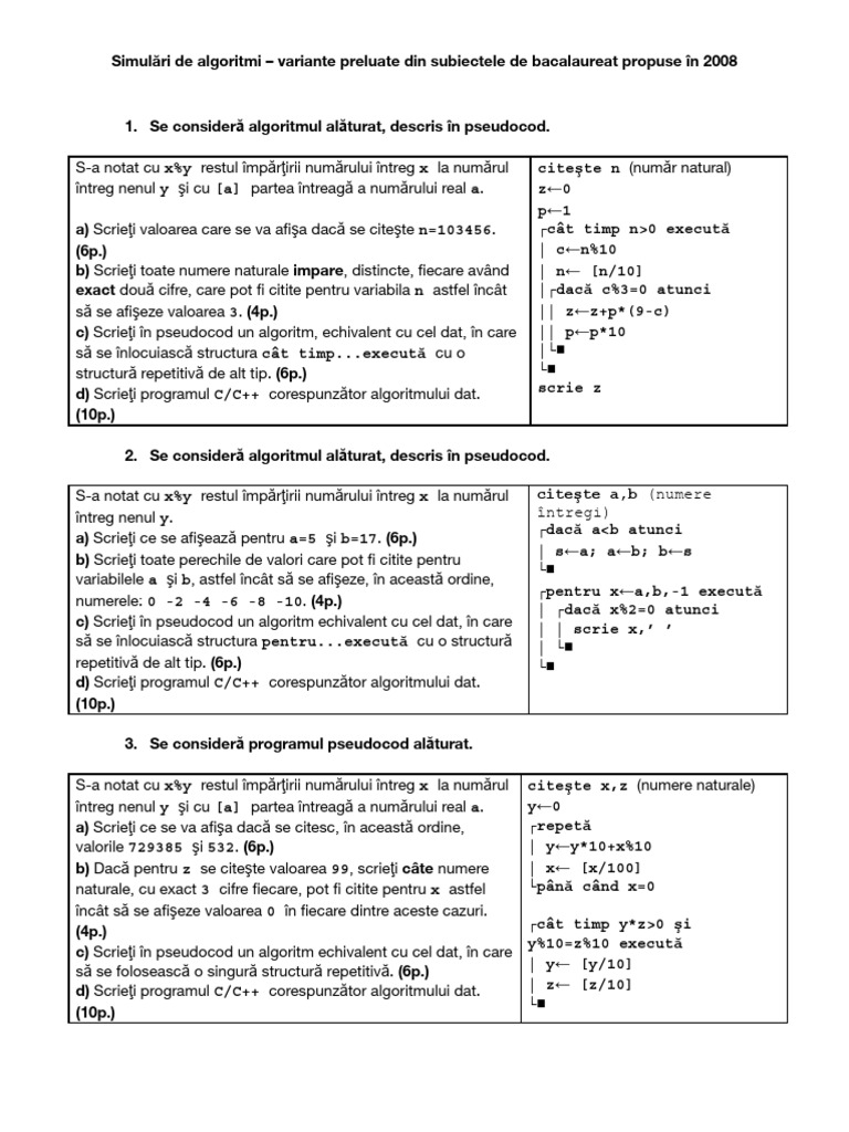 Simulări de algoritmi – variante preluate din subiectele de bacalaureat propuse în 2008
